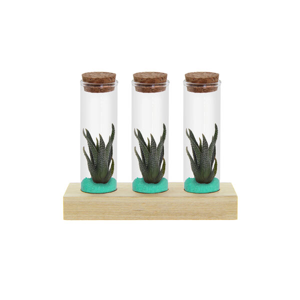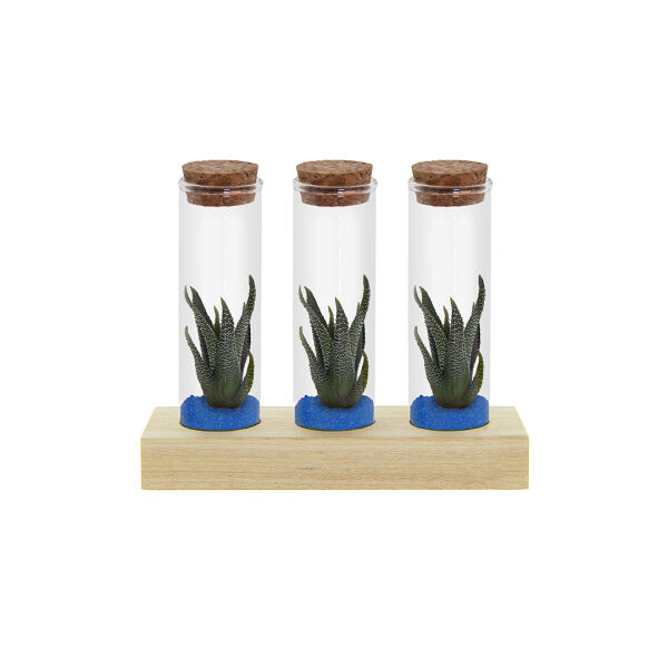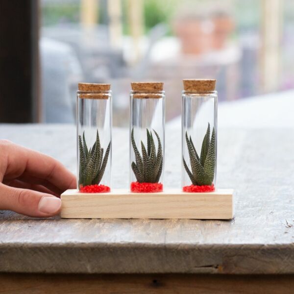 Deze luxe uitvoering bevat drie glazen flesjes, elk gevuld met levende mini-succulenten in een laagje zand of gekleurd grind. De flesjes zijn stijlvol gepresenteerd op een houten standaard die ruimte biedt voor personalisatie, bijvoorbeeld met een logo, bedrijfsnaam of korte boodschap.